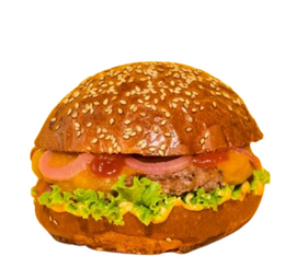 Carne 100% vacuno, puré de cebolla caramelizada, queso cheddar, bacon crocante, tomate y lechuga