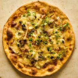 Crema de trufa, mozzarella, bacon, champiñón, cebolla roja, Grana Padano D.O.P., yema de huevo, rúcula y aceite de trufa blanca.