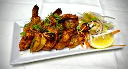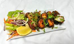 Brocheta de cordero suavemente especiada y asada al tandoor. Servido con salsa especial
