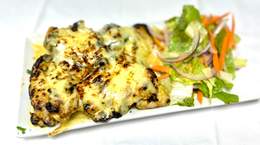 Muslo de pollo cocinado en tandoor; marinado con especias indias, yogur, zumo de limón con una ensalada especial del chef
