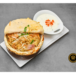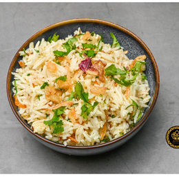 Azafrán cubierto de arroz basmati cocinado con una exótica miriada de sabores, servido con raita
