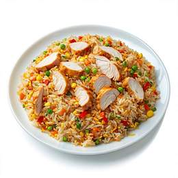 Pollo deshuesado cocinado con dados de cebolla, pimiento y salsa suave. Condimentado con cilantro fresco