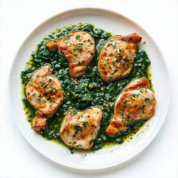 Pollo deshuesado cocido con salsa del chef, cubierto con hojas de cilantro.