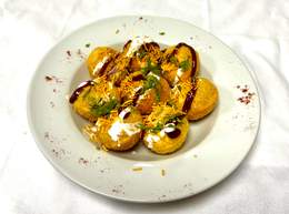 Burbujas de trigo rellenas de garbanzos y patatas, recubiertos con yogur, tamarindo y salsa de menta
