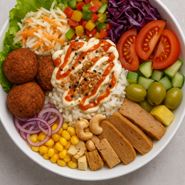 Falafel, seitán y tofu sobre arroz basmati y lechuga fresca, con mezcla de verduras coloridas y toppings crujientes. Elige tu salsa: blanca vegana, picante, agridulce, kétchup o mayonesa vegana picante.