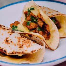 Tortilla de trigo con queso, cochinita pibíl y cebolla morada