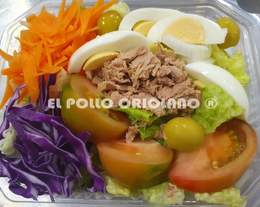 Ingredientes seleccionados 100% frescos del dia. Lechuga, tomate, cebolla roja, zanahora, lombarda, huevo duro, olivas y atún. Sólo Aliñar y a disfrutarla.