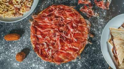 Con tomate, mozzarella, orégano, jamón ibérico y huevo.