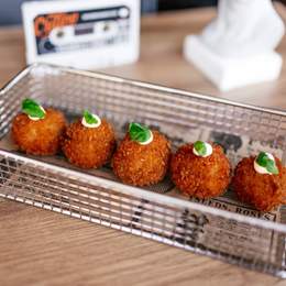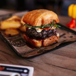 Pan de focaccia suave, salsa vitello tonnato, doble smash jugoso, crema de stracciatella y gorgonzola, picadillo de tomate seco y aceitunas negras, hojas de albahaca fritas y una crujiente teja de parmesano. Un bocado con carácter y tradición.