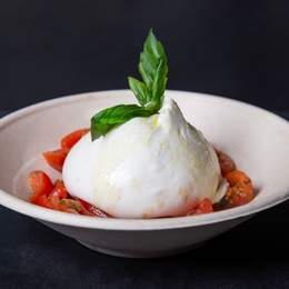 200g de Burrata Da Campana, Cherrys aliñados, Sal maldon y Aceite de Albahaca