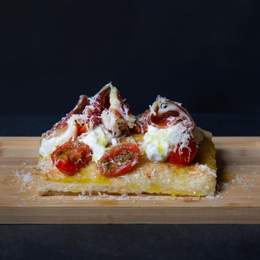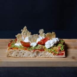 Focaccia con base bianca con Berenejena asada, tomate y crema parmesana.