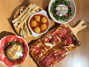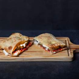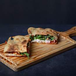 Focaccia rellena de Tomates pera mini asados, Pesto al Basilico, Rúcula y Burrata de campana.