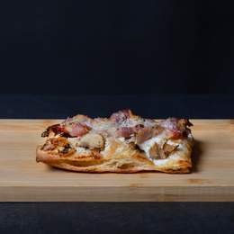 Base Bianca con una crema de mascarpone, pecorino y parmesano, setas Guanciale Tostado y Pecorino Romano