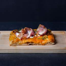 Pizza con base de crema de calabaza asada, Guancciale, cebolla macerada, Burrata de la Puglia y Hierba buena.