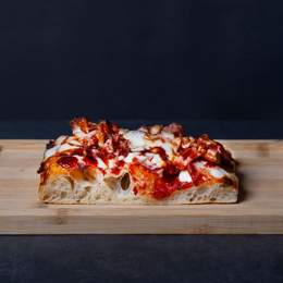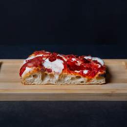 Pizza con base de salsa de tomate napolitana, mozzarella fior di latte y salami picante simonini.
