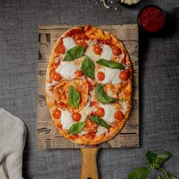 Salsa de tomate, mozzarella flor di latte, tomate cherry, burrata y albahaca.