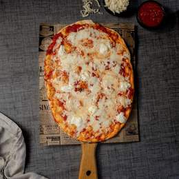 Salsa de tomate, mozzarella flor di latte, queso gorgonzola, queso de cabra y escamas de grana padano.