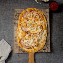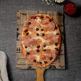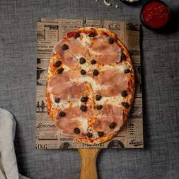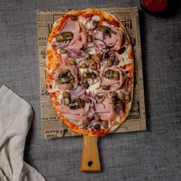 Salsa de tomate, mozzarella fior di latte, alcachofa, cebolla roja, prosciutto cotto y aceituna taggiasche