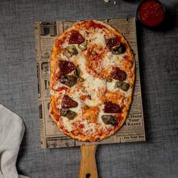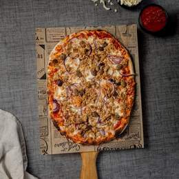 Salsa de tomate, mozzarella vegana, tomate seco, y alcachofa con un toque balsámico.