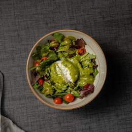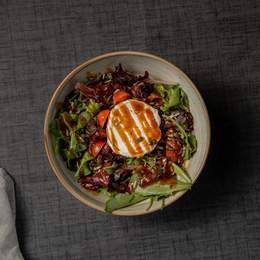 Brotes tiernos, medallón de queso de Cabra, tomate cherry, mix de frutos secos, salsa teriyaki.