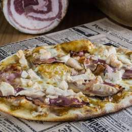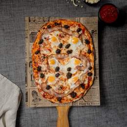 Salsa de tomate, mozzarella flor di latte, panceta italiana, huevos de codorniz y salsa de trufa.