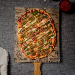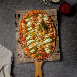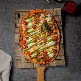 Salsa de tomate, mozzarella fior di latte, prosciutto di parma, burrata y salsa pesto.