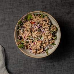 Brotes tiernos, mix de frutos secos, tomate cherry, bonito, cebolla roja y zumo de limón.
