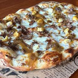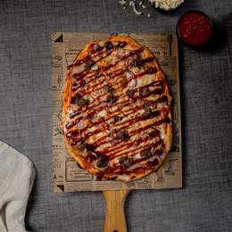 Salsa de tomate, mozzarella fior di latte, provola affumicata, carne picada de vaca rubia gallega con 45 días de maduración, panceta, cebolla roja y salsa barbacoa ahumada.