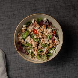 Brotes tiernos, mix de frutos secos, tomates cherry, pollo braseado, queso gorgonzola y vinagreta de miel módena.