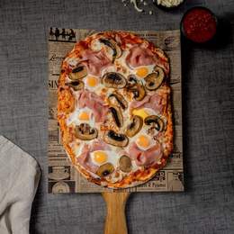 Salsa de tomate, mozzarella flor di latte, prosciutto cotto jamón cocido italiano, huevo de codorniz y champiñones frescos.