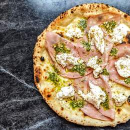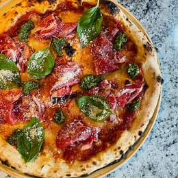 Salsa de tomate San Marzano aromatizada, mozzarella fior di latte, Coppa di Parma, Grana Padano DOP, albahaca y un toque de nuestro pesto de albahaca casero.