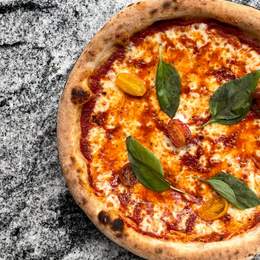 Salsa de tomate aromatizada, mozzarella fior di latte, grana padano DOP, tomates cherry marinados, albahaca fresca