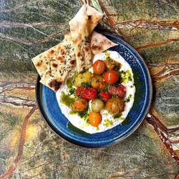 Cremosa stracciatella con tomates cherry asados, marinados en hierbas, aceite de oliva, sal y pimienta. Acompañada por nuestro pan de pizza de masa madre recién horneado