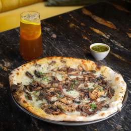 Salsa de tomate aromatizada, mozzarella fior di latte, grana padano DOP, prosciutto cotto, portobello asado