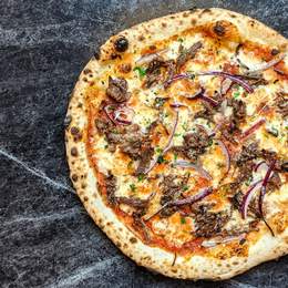 Nuestra versión de la clasica pizza barbacoa con salsa de tomate aromatizada, mozzarela fiordilatte, carrillera de ternera marinada con salsa barbacoa y especias, cebolla morada, grana padano DOP y un toque de perejil fresco.