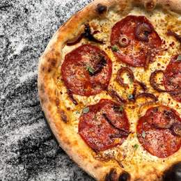 Salsa de tomate aromatizada, mozzarella fior di latte, grana padano DOP, salami ventricina picante, cebolla morada