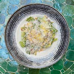 Ravioles rellenos de espinaca y ricota, brocolis, bañados en una salsa de limón, cubierto con mantequilla dorada, perejil y ralladura de lima.