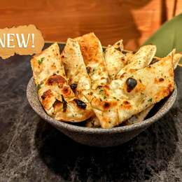 Nuestro pan de ajo casero, elaborado con pan de pizza de masa madre, nuestro aceite de ajo, mozzarella fior di late y un toque de Grana Padano DOP.