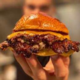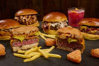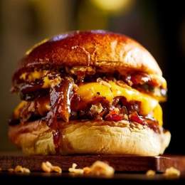 180 g de carne 100% ternera gallega con pulled pork cocinado a baja temperatura, queso cheddar, bacon y mayonesa chipotle picante, servida en pan potato roll y acompañada de patatas fritas.