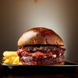 180 g de carne 100% ternera gallega con queso de cabra, sobrasada y mermelada de bacon y cebolla, servida pan potato roll y acompañada de patatas fritas.