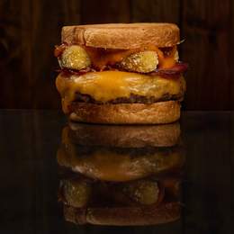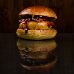 Pechuga 100% de pollo rebozado con queso cheddar, bacon, cebolla frita crujiente y nuestra mayonesa de barbacoa ahumada, servida en pan potato roll y acompañada de patatas fritas.