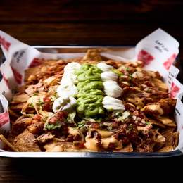 Tortitas de maíz con guacamole, chili con carne, crema agria y pico de gallo