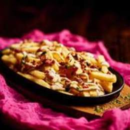 Patatas fritas con pulled pork cocinado a baja temperatura, salsa de queso y virutas de bacon crujiente