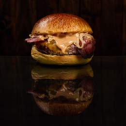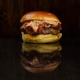 180 g de carne 100% ternera gallega con queso cheddar, bacon, cebolla crujiente y salsa barbacoa ahumada, servida en pan potato roll y acompañada de patatas fritas.