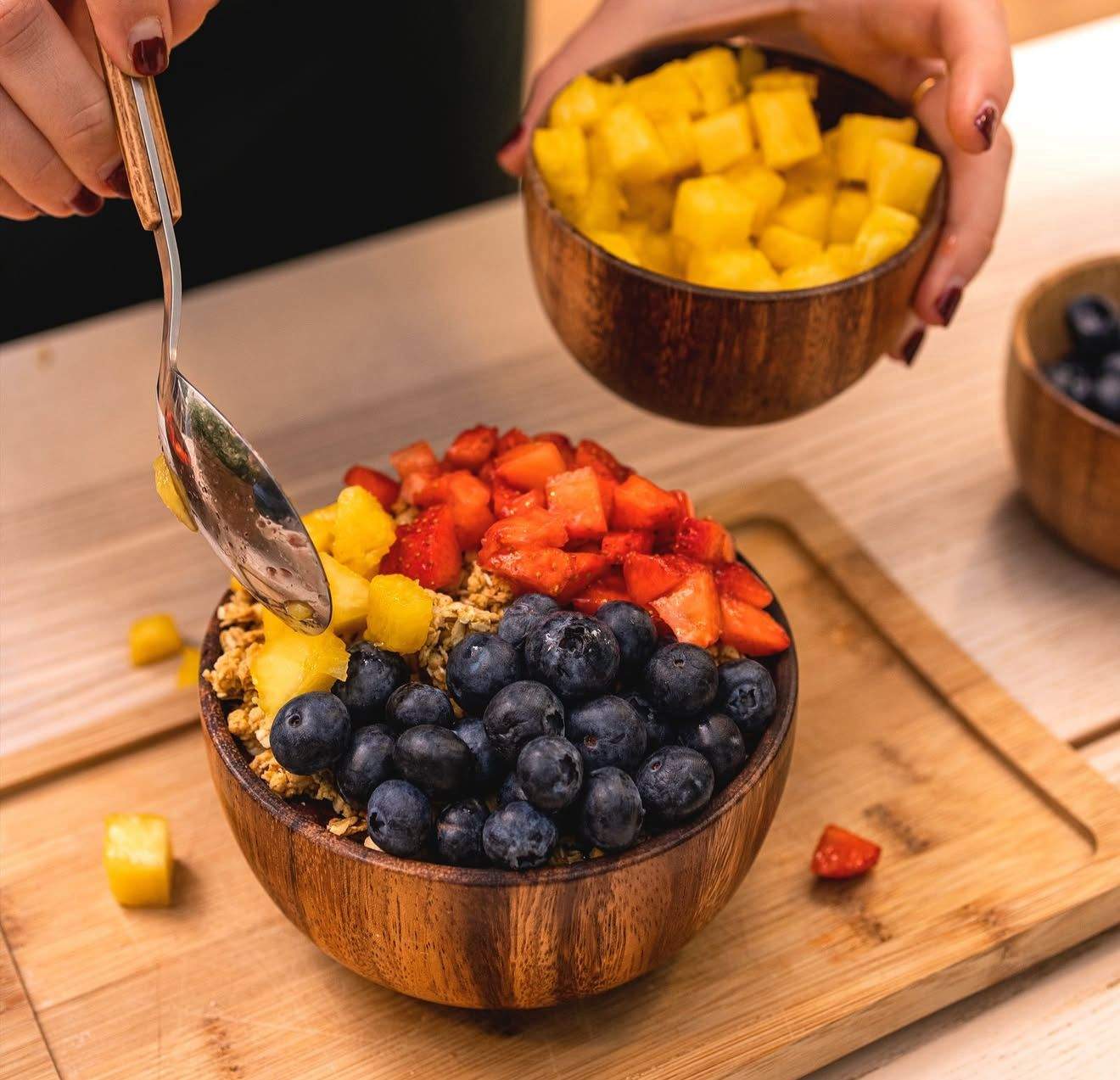Base de açaí, granola, yogurt griego, plátano, fresa, crema de cacao, cacahuetes y coco.Si quieres cambiar algún topping te recomendamos que uses la opción de crea tu bowl.