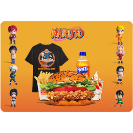 Si Naruto se multiplica, nuestro sabor también: queso fundido sobre doble pollo crujiente, lechuga, pepinillos y cebolla, bañados en exquisita salsa Big King, entre dos panes de semillas.Todo ello, acompañado del delicioso Sandy Naruto y la bebida que prefieras. Y de regalo, puedes llevarte la figurita de tu personaje favorito o, por dos euros más, una camiseta ¡Dattebayo!