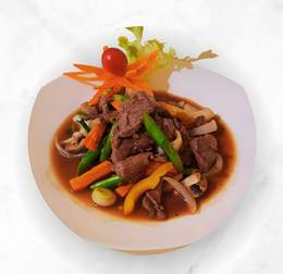 Ternera, brócoli, pimiento, cebolla, ajo, salsa de soja, salsa de ostras, acompañado de arroz Jasmine, puede contener trazas de marisco