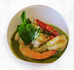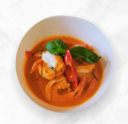Curry rojo con langostinos, verdura y leche de coco, acompañados de arroz Jasmine
