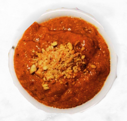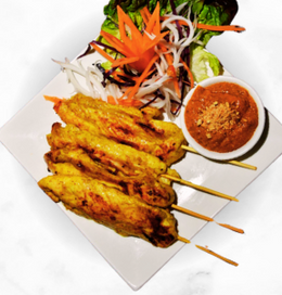 Brochetas de pollo al curry amarillo, cúrcuma y leche de coco, servido con salsa de cacahuete