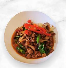 Salteado al wok, con pimientos, cebolla, albahaca, champiñones y judías verdes, acompañado de arroz Jasmin